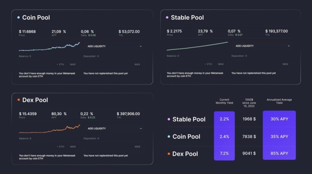 Abbiamo integrato oltre 450 pool di punta provenienti da 25 blockchain in tre indici unici. Questo permette agli investitori di creare portafogli diversificando e guadagnando rendimenti stabili senza configurazioni complesse.